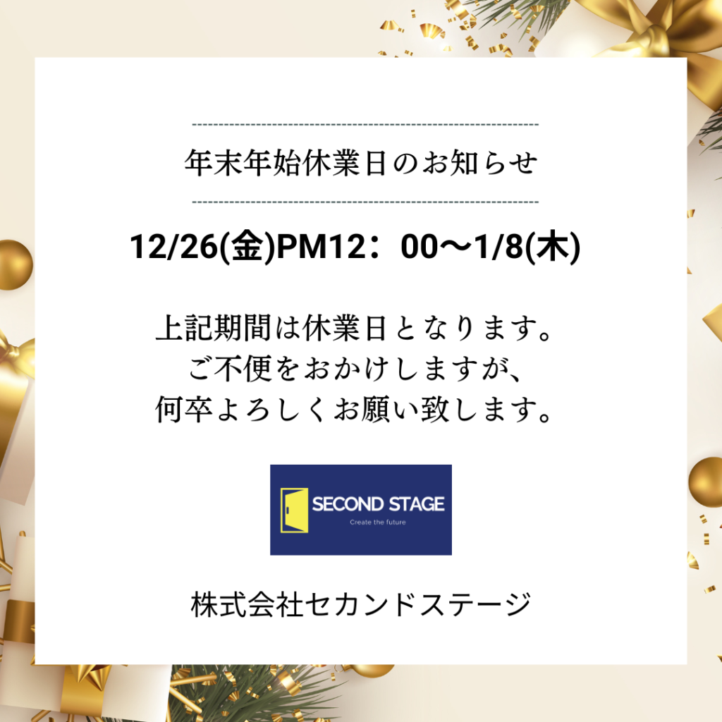 2025年11月13日 / 最終更新日時 : 2025年11月13日 2-stage 日々のブログ 年末年始休業日のお知らせ 年末年始休業日のお知らせ:12/26(金)PM12:00〜1/8(木)ご不便をおかけしますが何卒宜しくお願いします。 Follow me!
